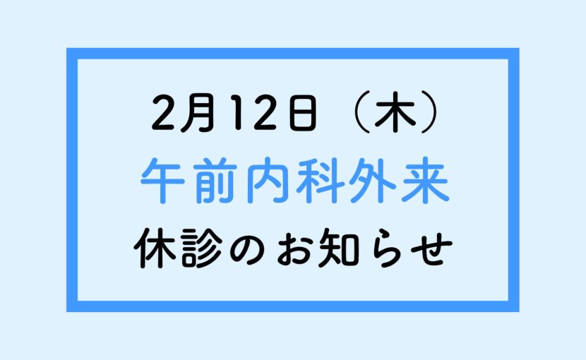 午前内科外来休診のお知らせ2026.02.12 Tweet午前内科外来休診のお知らせ2月12日(木) 午前診 内科外来 爲定Dr 上記、休診とさせて頂きます。何卒、ご了承のほどお願い申し上げます。 相原第二病 Tweet午前内科外来休診のお知らせ前の記事午前内科外来休診のお知らせ次の記事